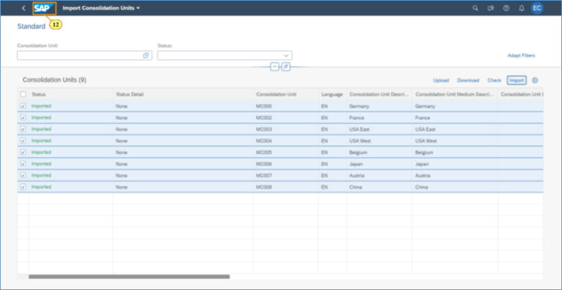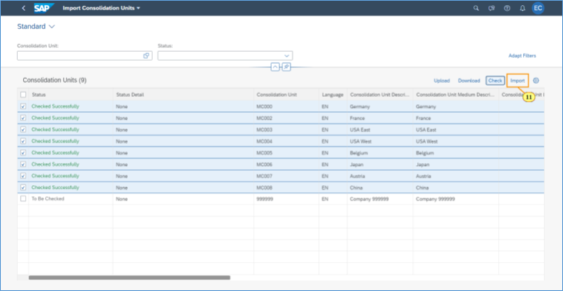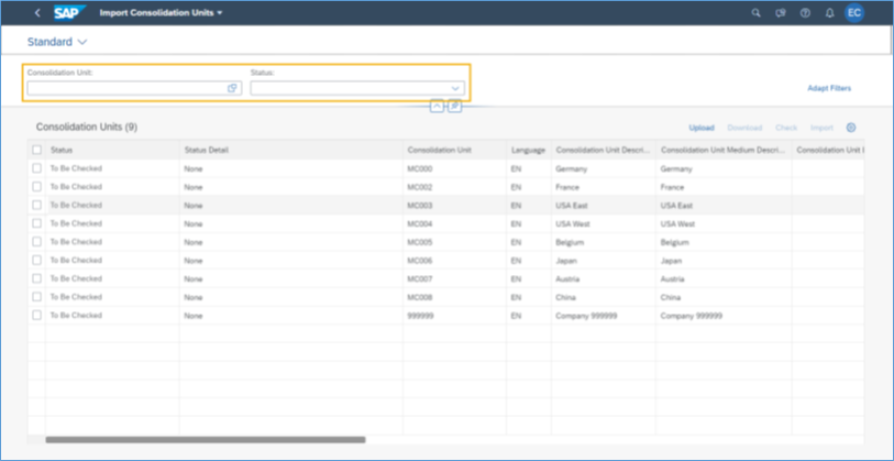 Si tiene un gran volumen de datos maestros de unidades de consolidación, puede usar los filtros provistos para mostrar unidades específicas para verificación. Para este tutorial, no requerimos filtros.