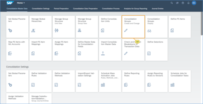 13. Para crear datos de demostración o adaptar datos para configuraciones específicas del proyecto, cree un grupo de consolidación. Para abrir la aplicación, seleccione el mosaico Grupos de consolidación – Crear y cambiar.