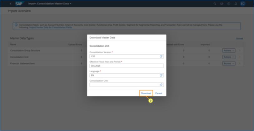 2. En la fila Unidad de consolidación, seleccione Acciones > Descargar datos maestros.