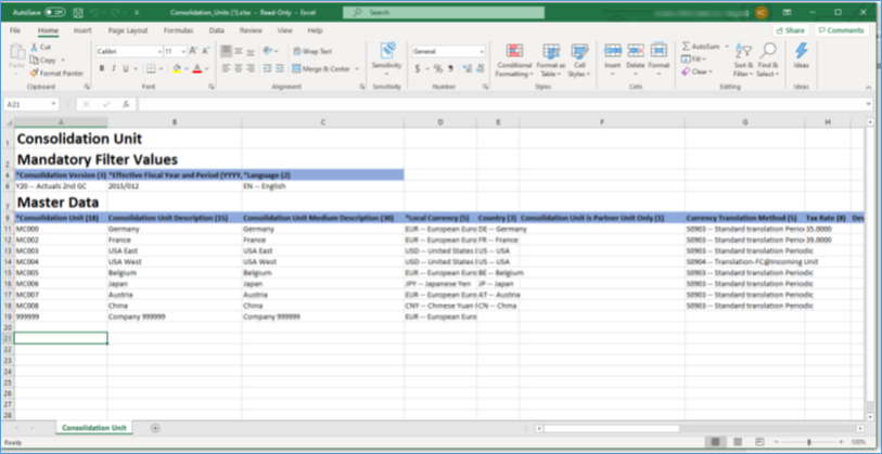 4. Se descargan los datos maestros de la unidad de consolidación seleccionada. Para abrirlo, elija el archivo descargado.