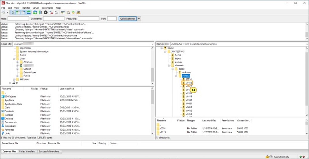 Se muestra correctamente el mensaje de estado Directorio que enumera «/home/S4HTESTHCI».
