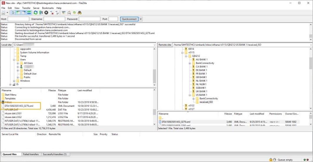 Si SAP S/4HANA es integrado con Multi-Bank Connectivity (MBC) y se crea un formato de banco de trabajo de medio de pago (PMW) para la conectividad MBC, el archivo del medio de pago se envía a MBC automáticamente a través del conector MBC. Este archivo de medio de pago se mostrará en la carpeta Protocolo seguro de transferencia de archivos (SFTP) si este archivo no tiene ningún error.